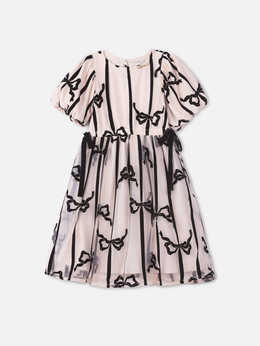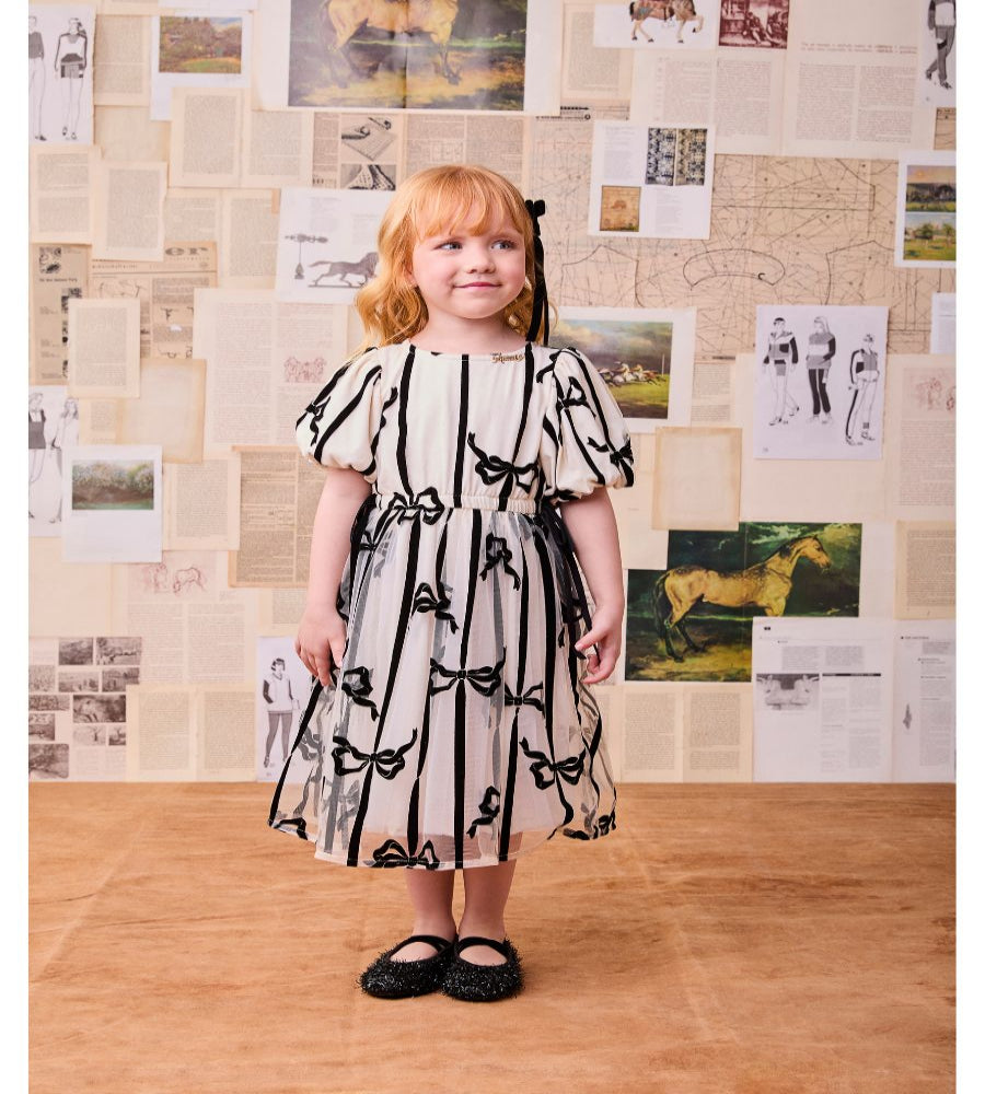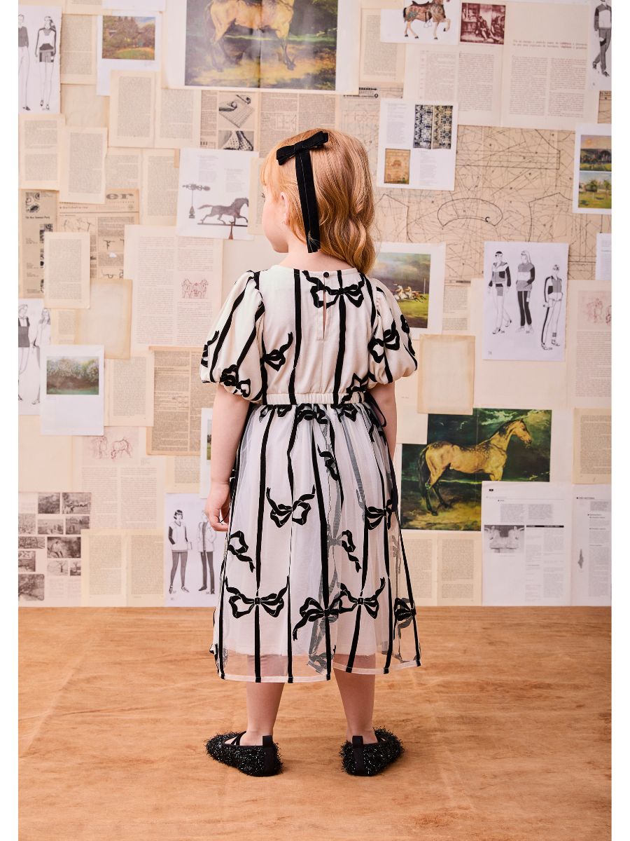 Vestido MC de tule com estampa flocada de laços 100% poliamida. Com forro de malha 100% algodão. Boca da mangas e cintura com elástico funcional embutido. Decote costas com gota + botão de massa personalizado. Cintura com laço decorativo. Decote frente com placa decorativa Animê.